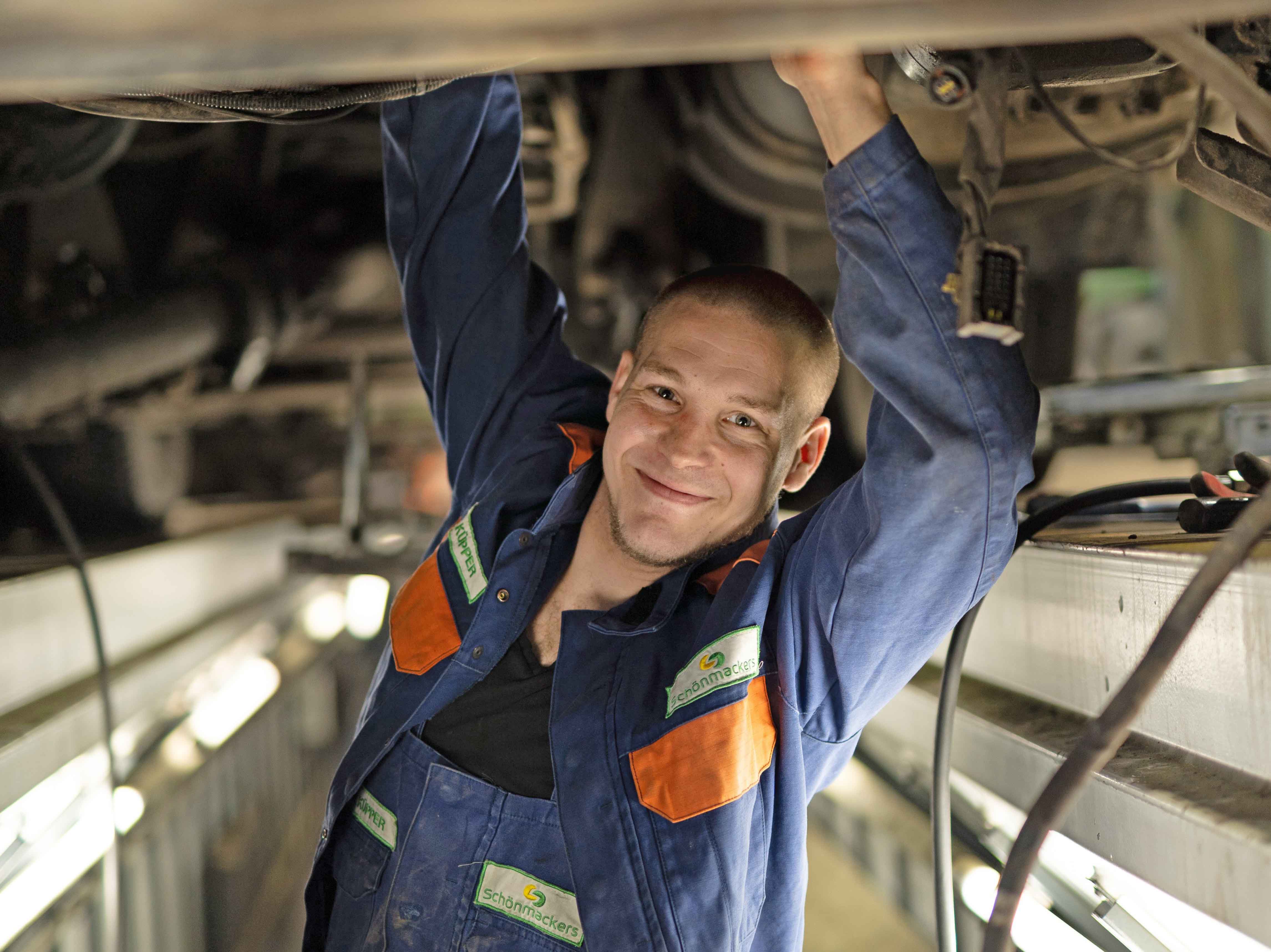 Dominic Küpper ist Kfz-Mechatroniker bei Schönmackers in Mechernich und seit seiner Ausbildung Teil des Teams. Er kennt die Fahrzeuge und Abläufe in- und auswendig und sorgt dafür, dass die LKW zuverlässig unterwegs sind. Mit Technikleidenschaft und Teamgeist zeigt er, wie vielseitig die Werkstatt ist und dass auch Einsteiger hier gute Entwicklungschancen haben.